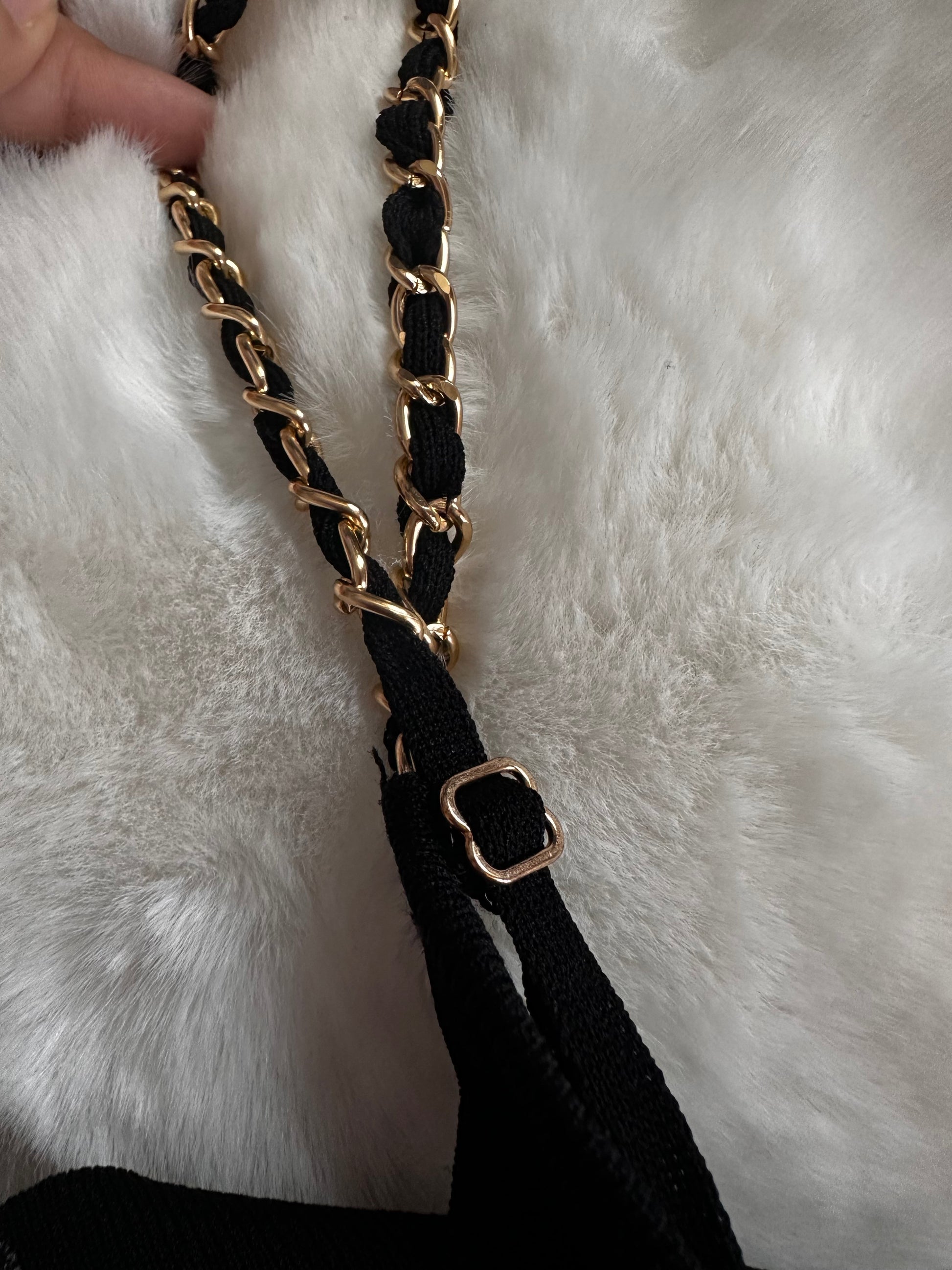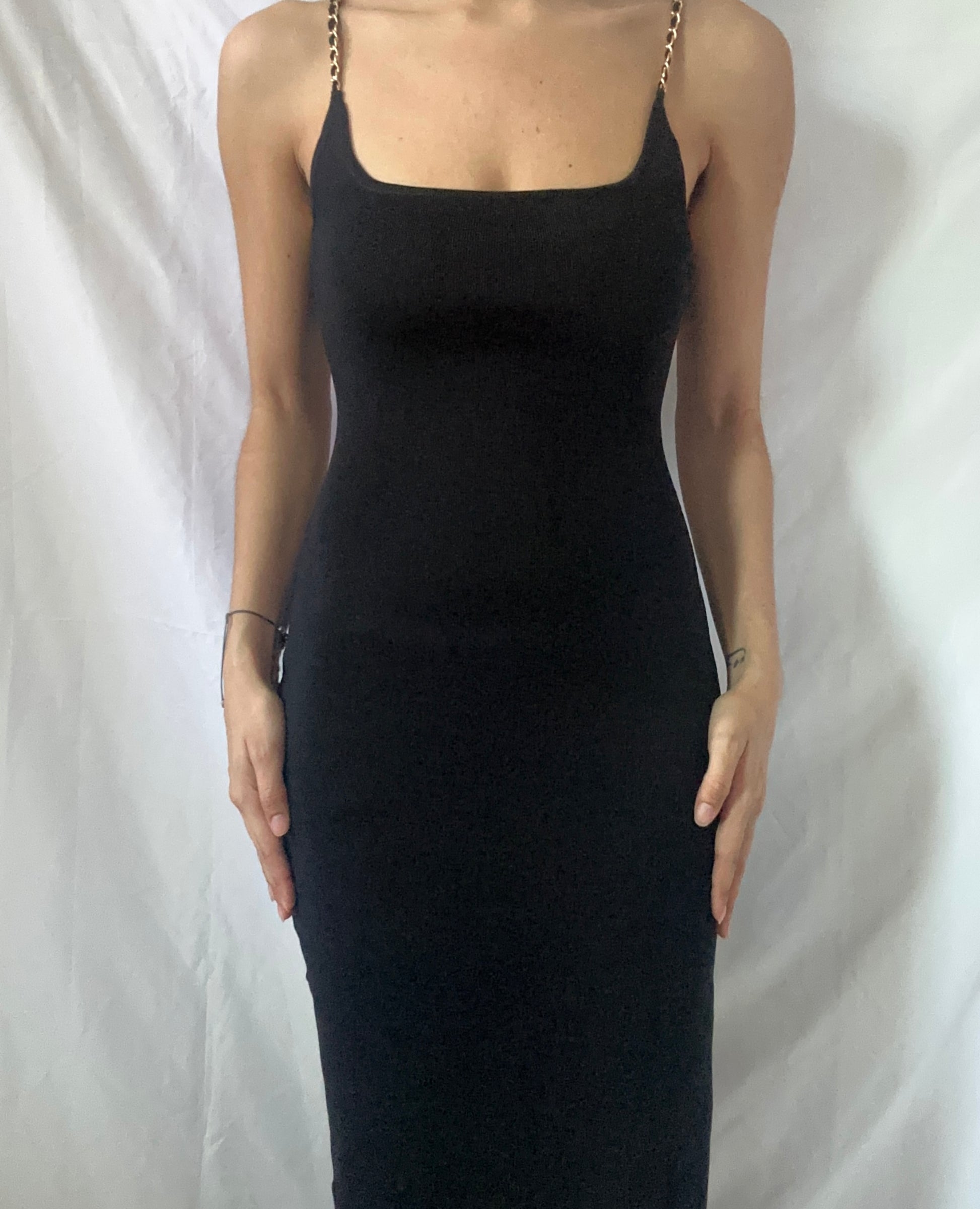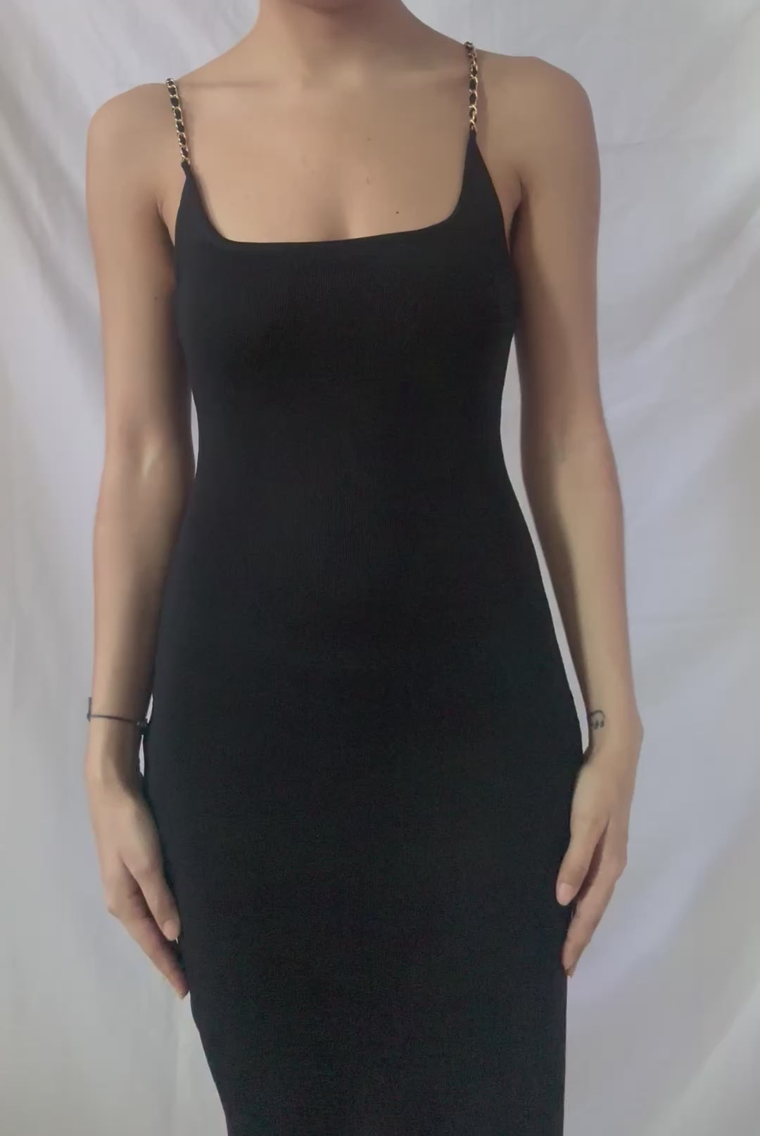 Upgrade your wardrobe with our premium Chain Tank Slit Dress. Featuring a classic, little black dress design, this elegant piece is perfect for any occasion. The delicate chain detail and flattering slit add a touch of sophistication to your look. Elevate your style with this must-have LBD.